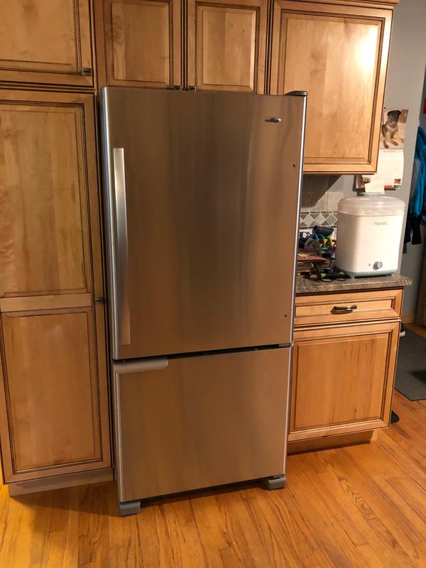 29 Inch Wide Bottom Freezer Refrigerator With Garden Fresh Crisper Bins 18 Cu Ft Capacity Stainless Steel Abb1921brm Amana